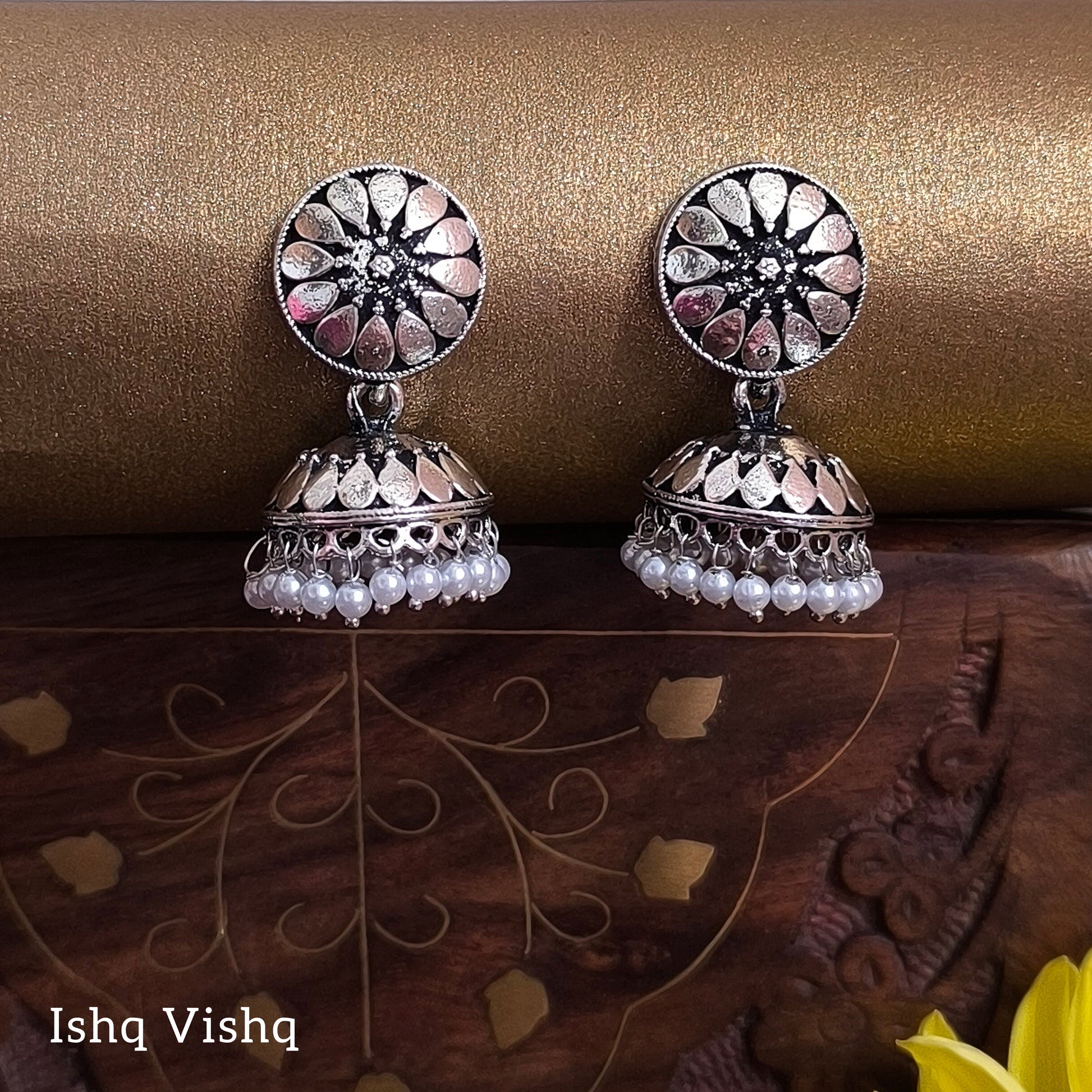 Silver Oxidised Floral Design Pearl Drops Jhumka